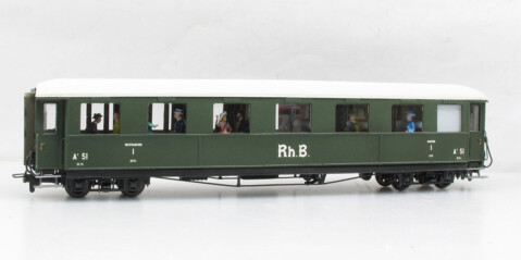 Schon lange wollte ich den A 51 bauen und suchte immer wieder nach Wagenmodelle, die sich dafür einen Umbau eignen können. Es war der erste Personenwagen mit geschlossener Plattform bei der RhB. 1913 wurde der A 51 und 52 an die RhB geliefert und im 14 kam noch der A 53 dazu. Als Basismodell wollte ich ein Bemowagen nehmen. Da viel mir der AB 1615 in die Hände.