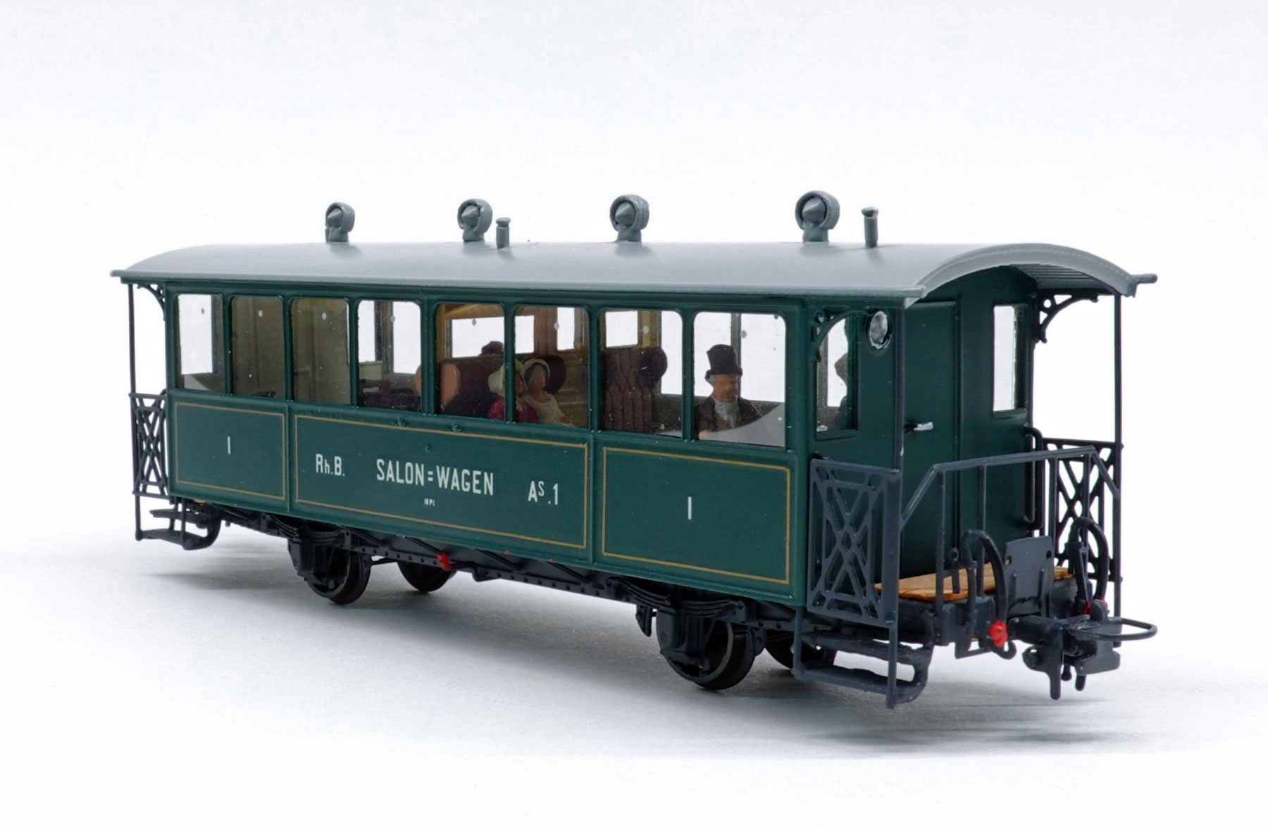 Dieser Salonwagen wurde aus dem Bausatz B 2094 von Swiss-Rail gebaut. (2001) Die Inneeinrichtung mit Drehstühlen baute ich wie auf einem alten Foto zu sehen ist nach. Das Vorbild ist heute ein gelber Bernina-Salonwagen bei der Museumsbahn Blonay-Chamby.