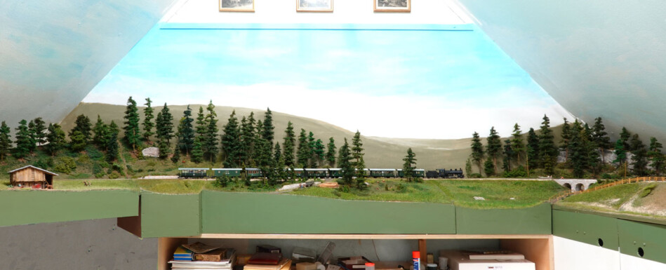 Ein Aspekt meiner Anlage, der mich seit einiger Zeit beschäftigt hat, war die linke Ausfahrt an der Station Wiesen. Die Dachschräge im Dachboden zur Wand passt optisch nicht ideal in das Gesamtbild. Zudem ist der alte Hintergrund aus grau-grünem Papier inzwischen in die Jahre gekommen. Das Eckmodul mit der Bahndammunterführung musste im hinteren Bereich zur Ecke hin höher gestaltet werden. Aus diesem Grund wurde das Modul in den Keller gebracht und entsprechend umgebaut.