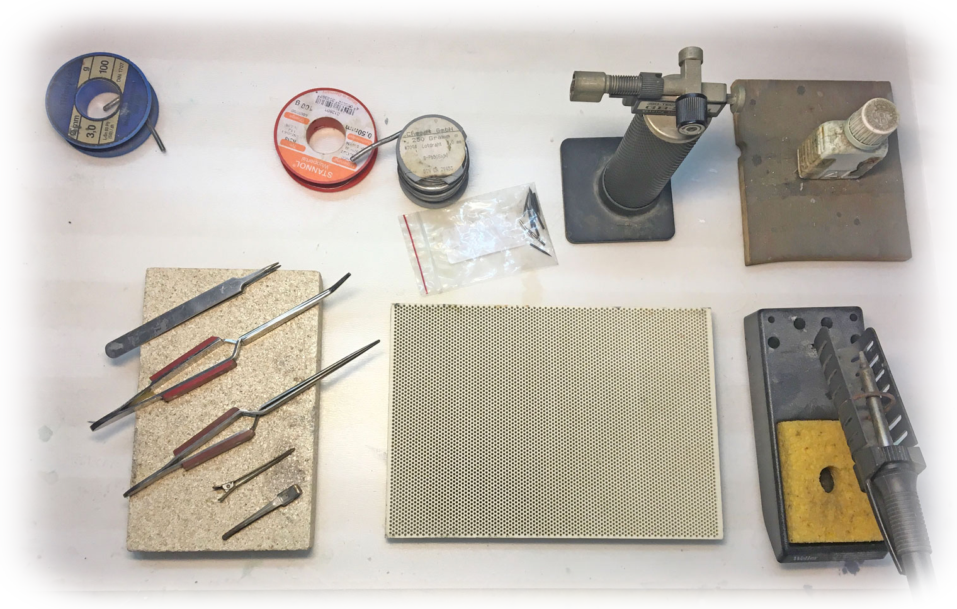 Zum Arbeiten habe ich noch folgende Utensilien: Lötauflagen, Zinn, Pinzetten, Lötwasser, Entlötlitzen und eine Schale mit Wasser und Zitronensaft.
