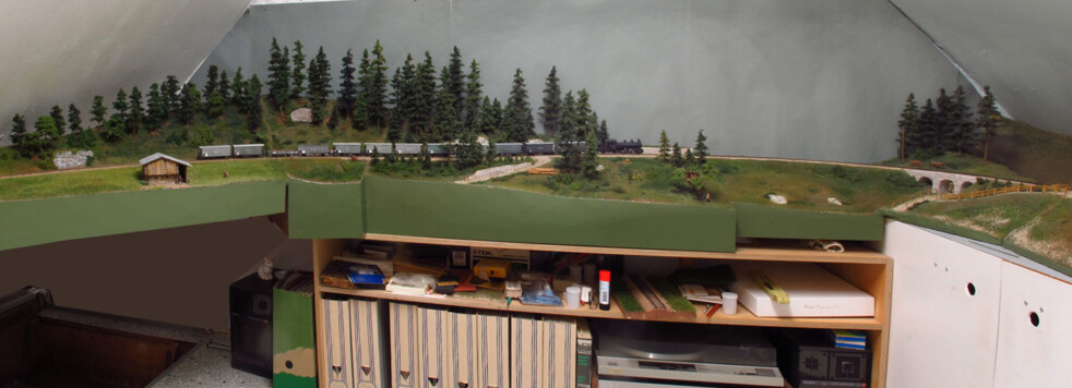Was mich schon länger an meiner Anlage gestört hat, war die linke Ausfahrt von der Station Wiesen, da im Dachboden die Dachschräge zur Wand nicht gerade sehr schön zum Ansehen ist. Auch der alte Hintergrund aus grau-grünen Papier ins alter gekommen. Das Eckmodul mit der Bahndammunterführung musste hinten zur Ecke einfacher noch höher gestaltet werden. Also wurde das Modul in den Keller bugsiert und dementsprechend umgebaut.